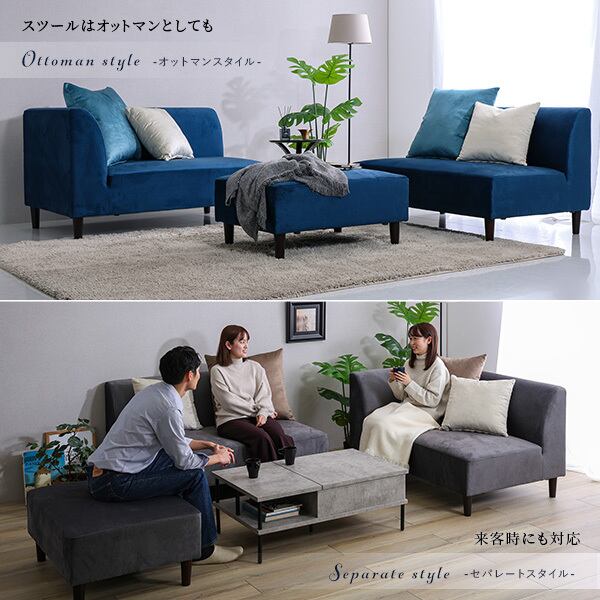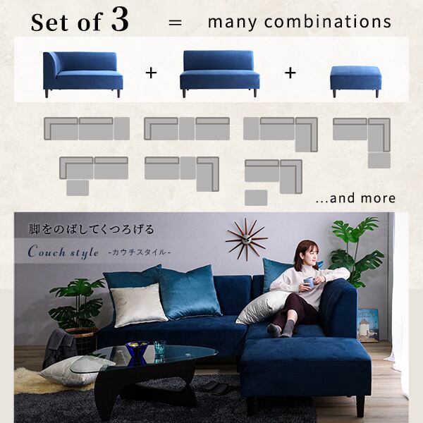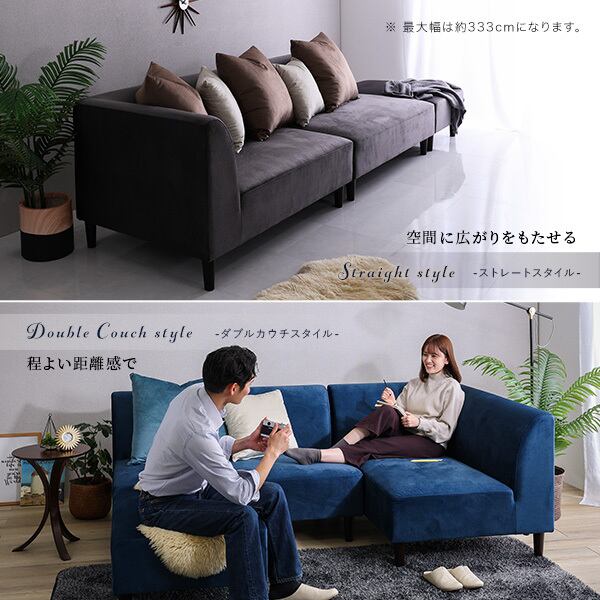 クッション付き 組み替え可能なベロアカウチソファ【VELUURI ベルーリ】