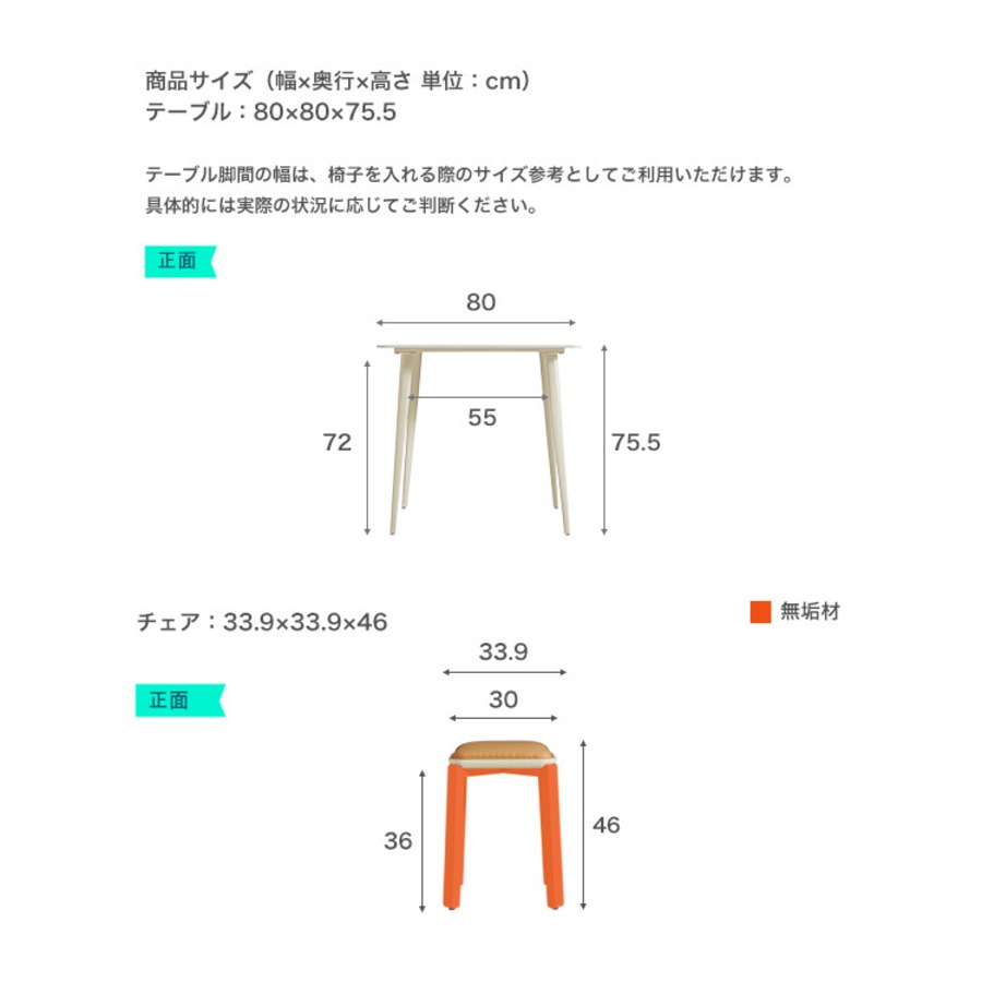 テーブル:80cm×80cm×75.5cm、チェア:33.9cm×33.9cm×46cm