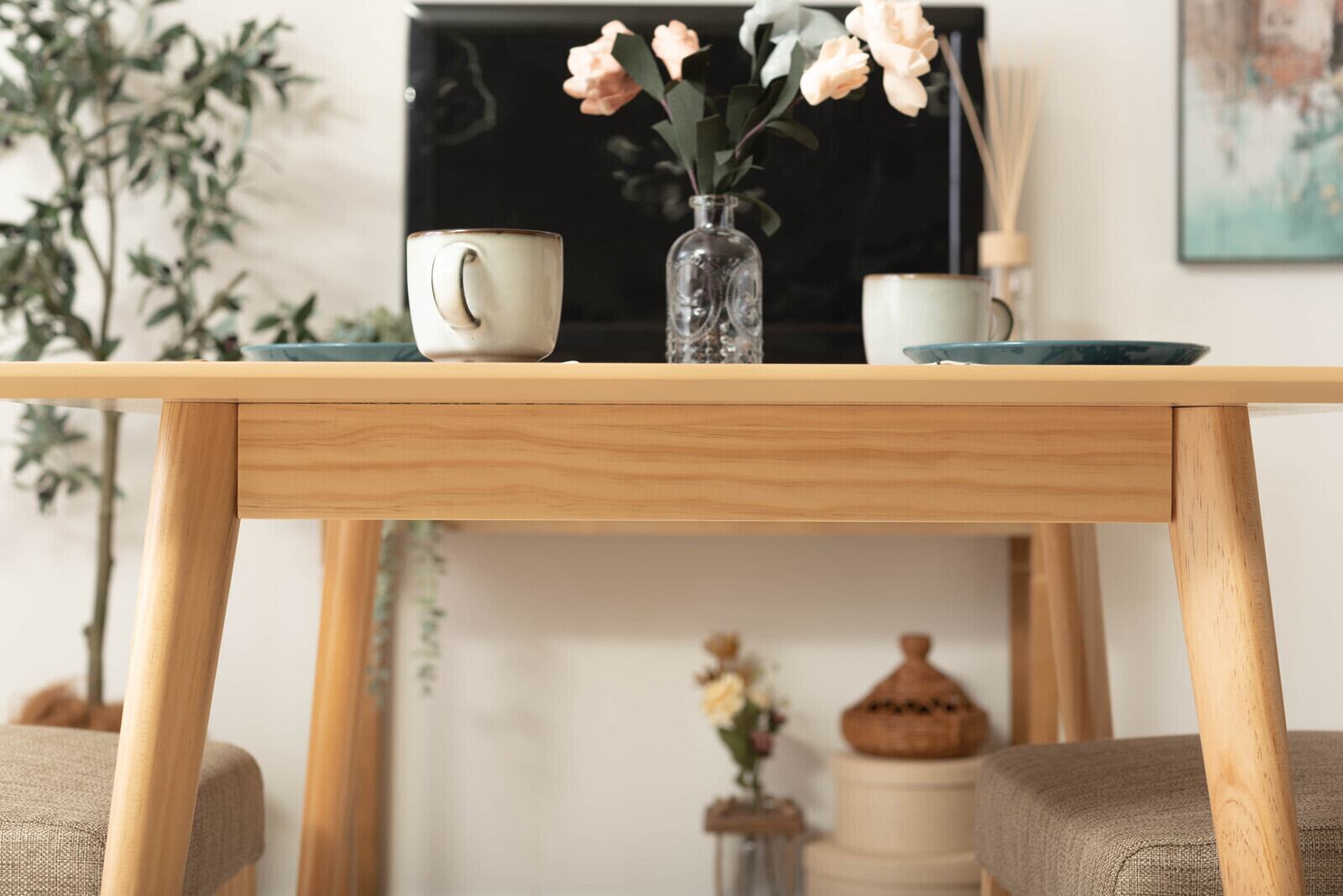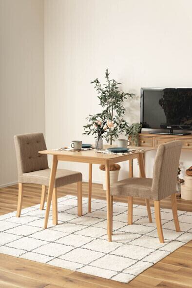 どんなインテリアにも合わせやすい、シンプルなスクエアテーブルは省スペース向けのサイズながら、2人使いでもゆったりと食事ができる80角サイズです。