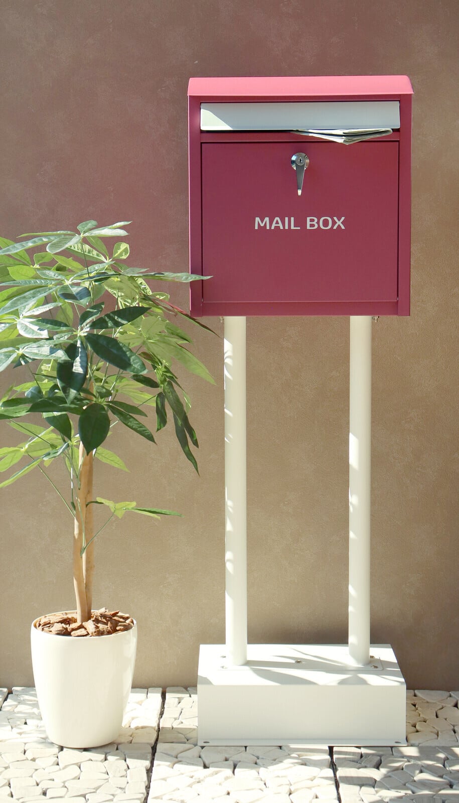 カラーは上品な色合いのワインレッドとくすんだブルーのラベンダーブルーで、脚と台座部、郵便投函口はホワイトになります。