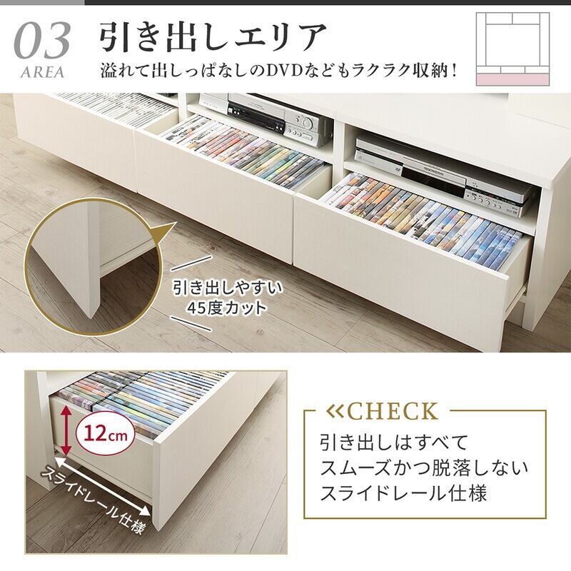 魅せる、隠すを手助けする全部で5つの収納エリア、50V型まで対応。