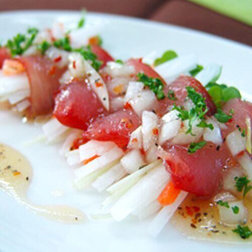 ●まぐろ(太平洋)、食塩、食用植物油脂、香辛料(タイム・ローレル)/ソルビトール、pH調整剤、酸化防止剤(V.C)、燻液、着色料(モナスカス,アナトー,ラック)、保存料(分解ペクチン)