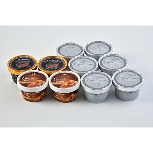 十勝橋本牧場の希少なブラウンスイス牛の生乳を使用した、プレミアムアイスとキャラメルを入れたキャラメルアイス、チョコレートアイスにハードチョコとチョコチップを入れたザッハトルテアイスのセットです。