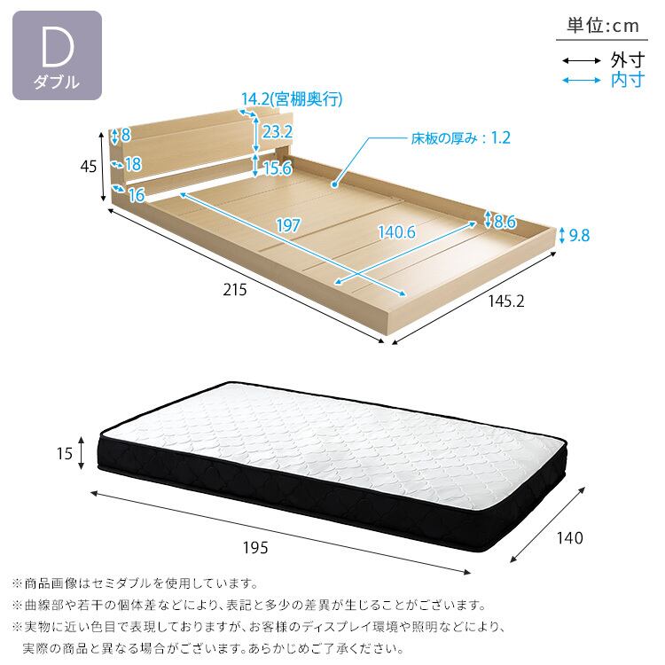 マットレスD:(約)幅140×奥行195×高さ15cm(コイル数:682個)