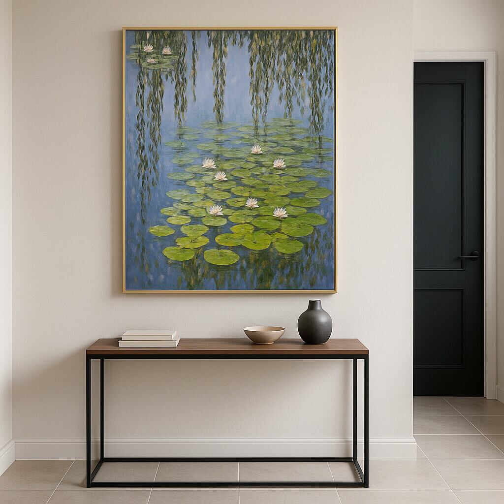 静かな池に浮かぶ睡蓮と、そよぐ柳が織りなす癒しの風景を再現したアートパネルです。