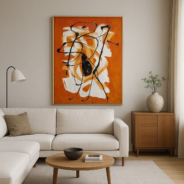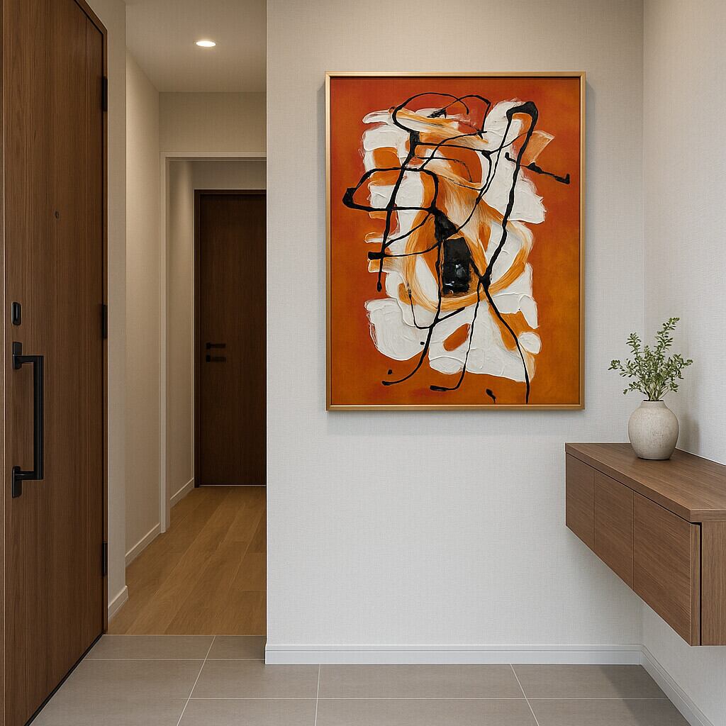 オレンジとホワイトの重なりに、黒のドロッピングがアクセントとなり、抽象的ながらも力強い存在感を放ちます。
