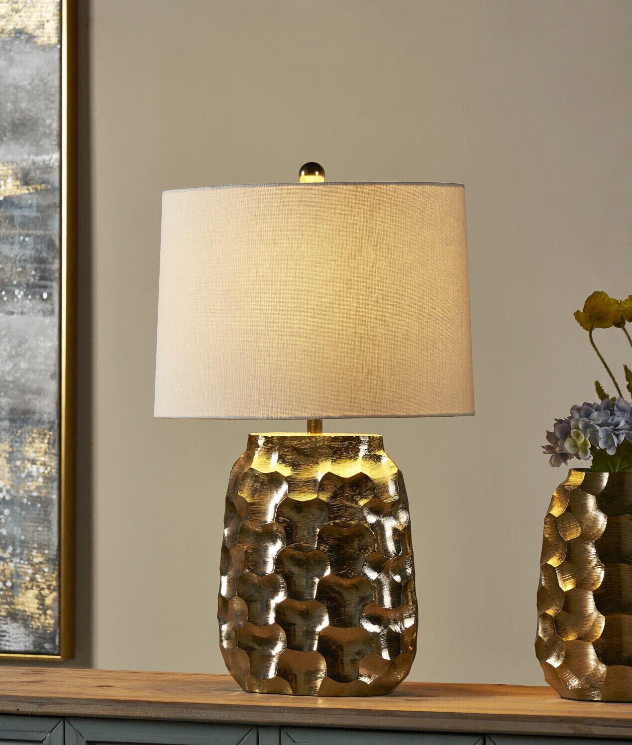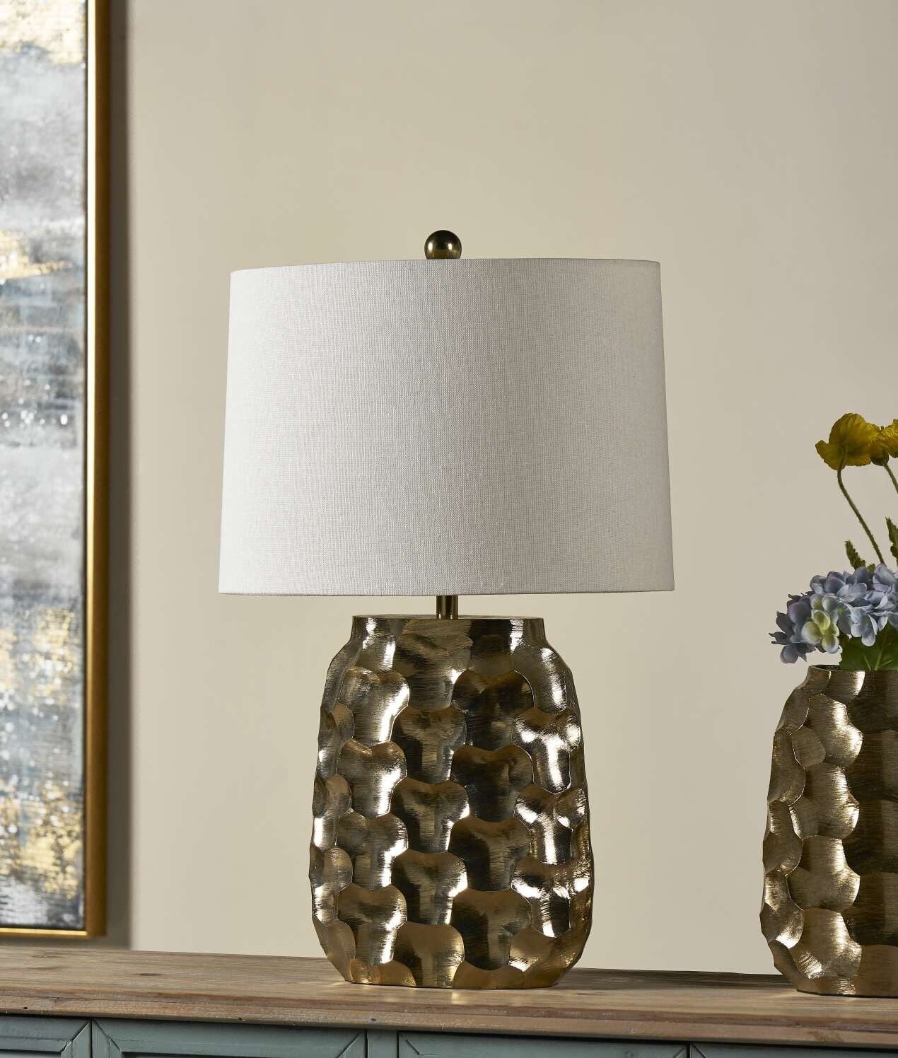 立体的なハニカムパターンが目を引く、重厚感あふれるゴールドのメタルベースが特徴のテーブルランプです。