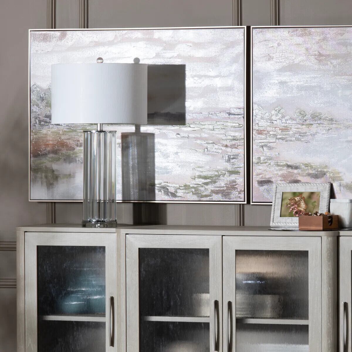 磨き上げられたニッケルのベースに、ファセットカット(多面カット)のクリスタルストリップを美しく配したテーブルランプです。