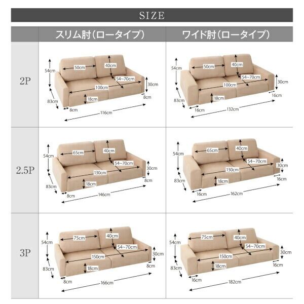 2P:(ワイド肘/スリム肘・ロータイプ/ハイタイプ)