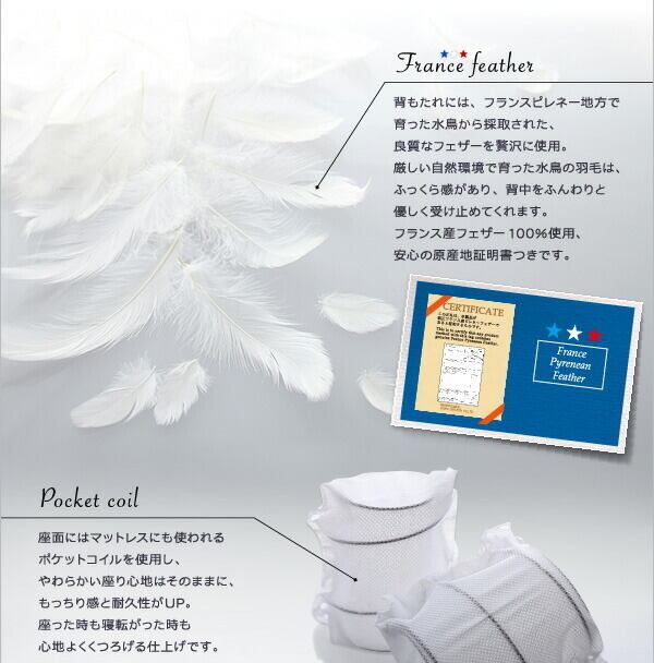 厳しい自然環境で育った水鳥の羽毛は、ふっくら感があり、背中をふんわりと優しく受け止めてくれます。フランス産フェザー100%使用、安心の原産地証明書つきです。