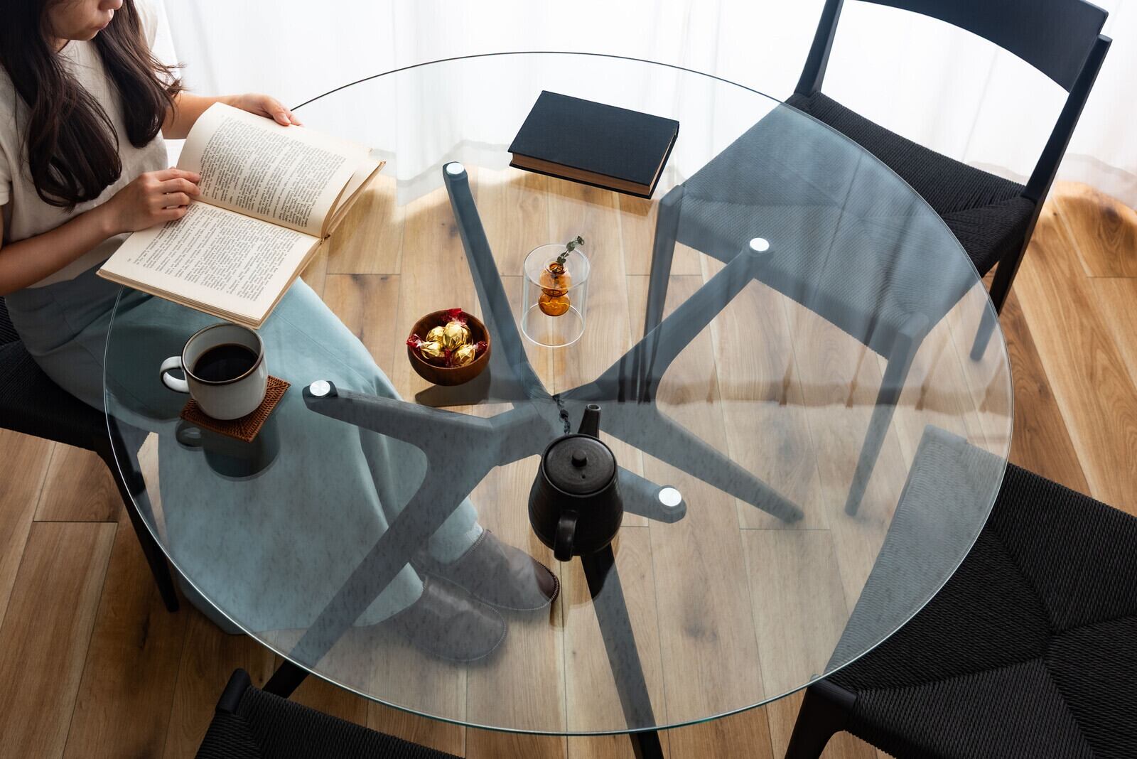 クリアガラスの天板が、開放感のある上質な空間を演出します。天板には透明度の高い8㎜強化ガラスを採用しております。視界を遮ることなく空間をすっきりと見せてくれます。