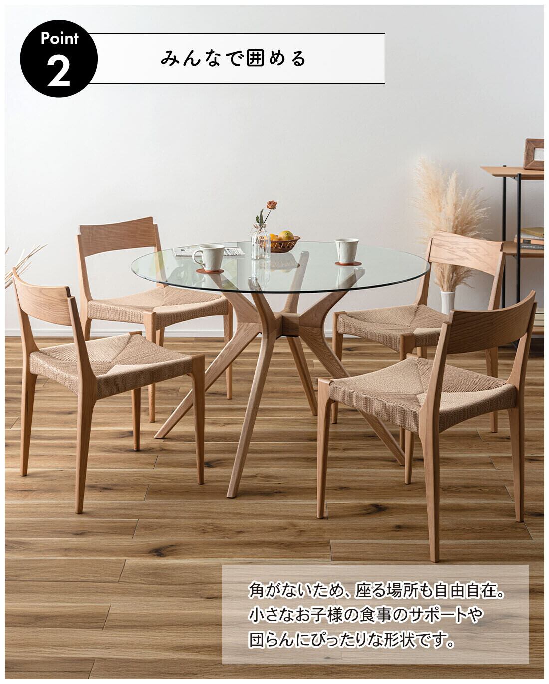 円形天板なので、どの場所でも自由に座れます。小さなお子様の食事のサポートや団らんにぴったりな形状です。