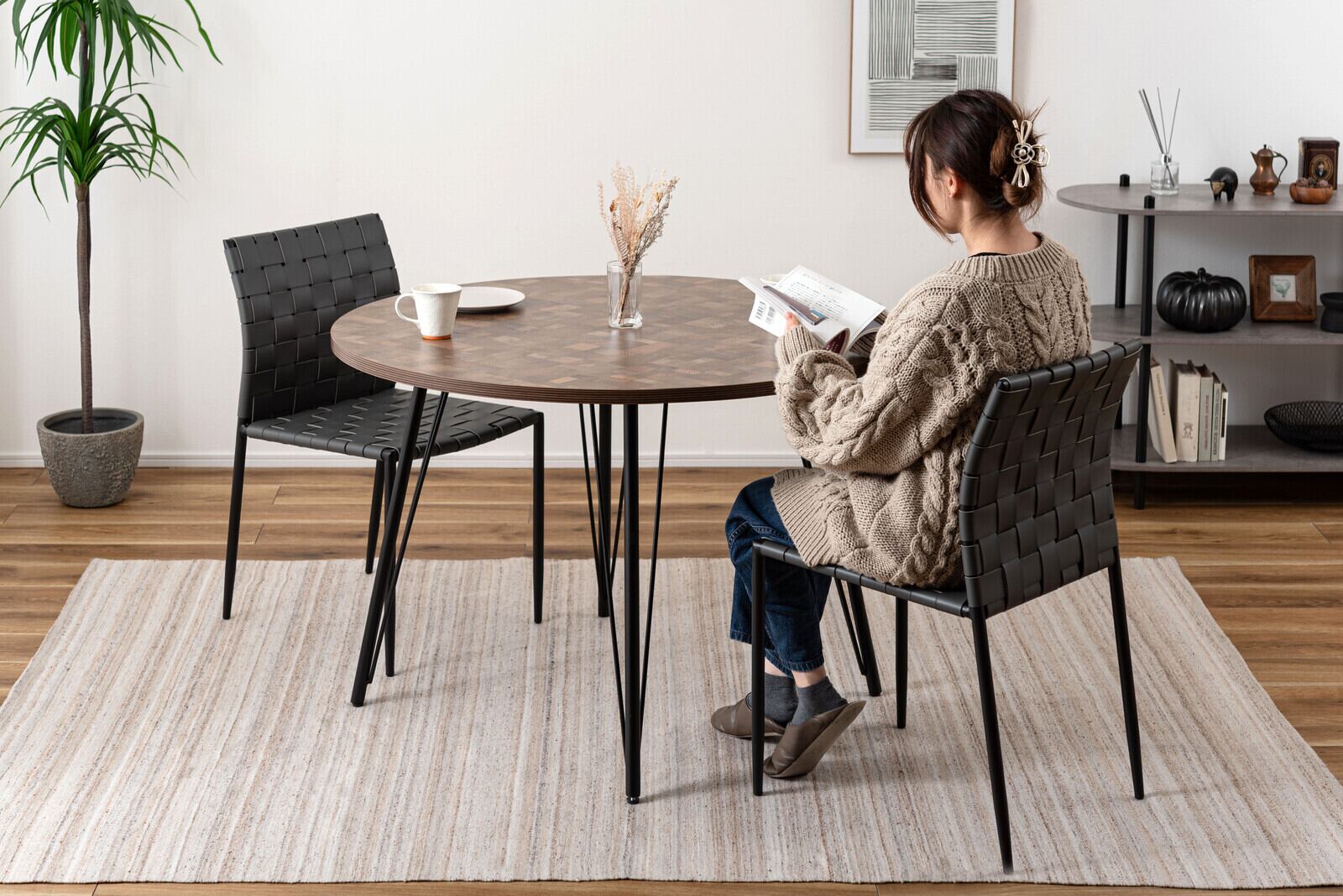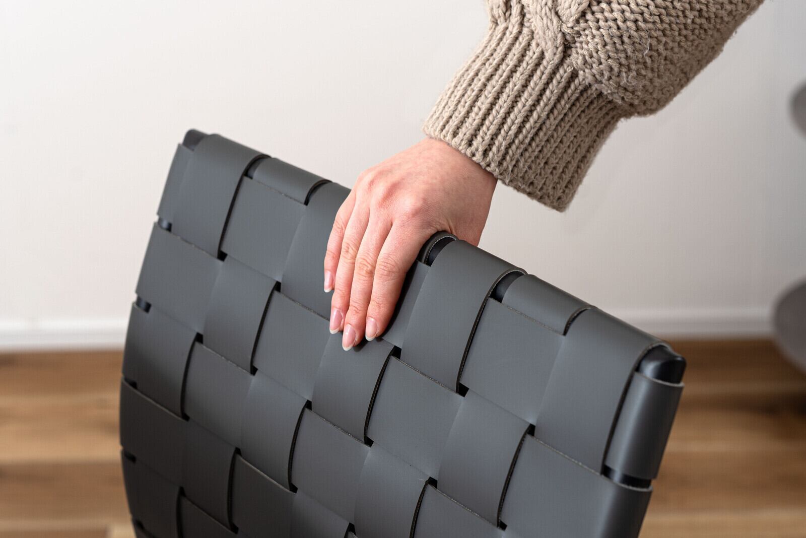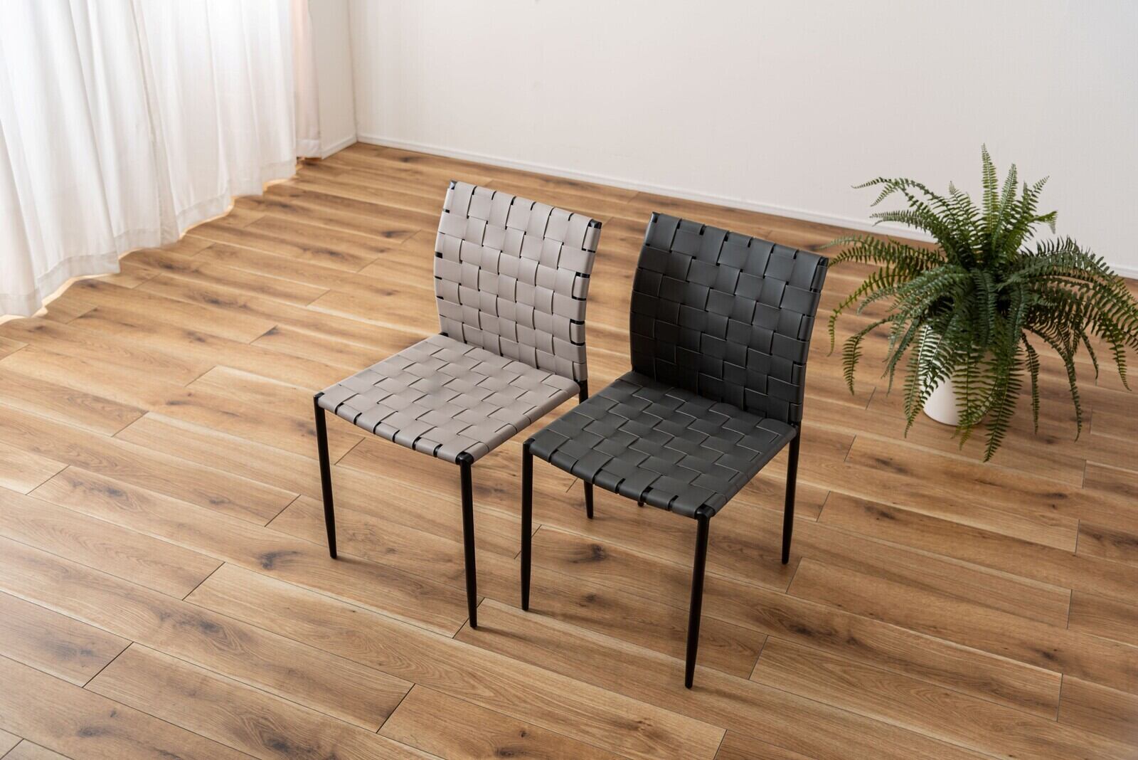 合皮の生地を編み込んだ背もたれと座面が程よくしなり、 ゆったりと身体を支えてくれるチェアです。